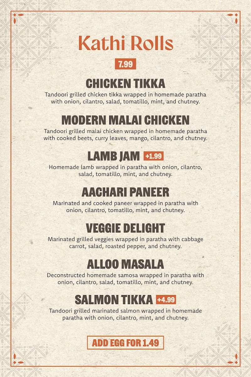 Juicy chicken tikka, crunchy onions, fresh cilantro, and a zesty tomatillo mint chutney all wrapped up in a tasty roll!