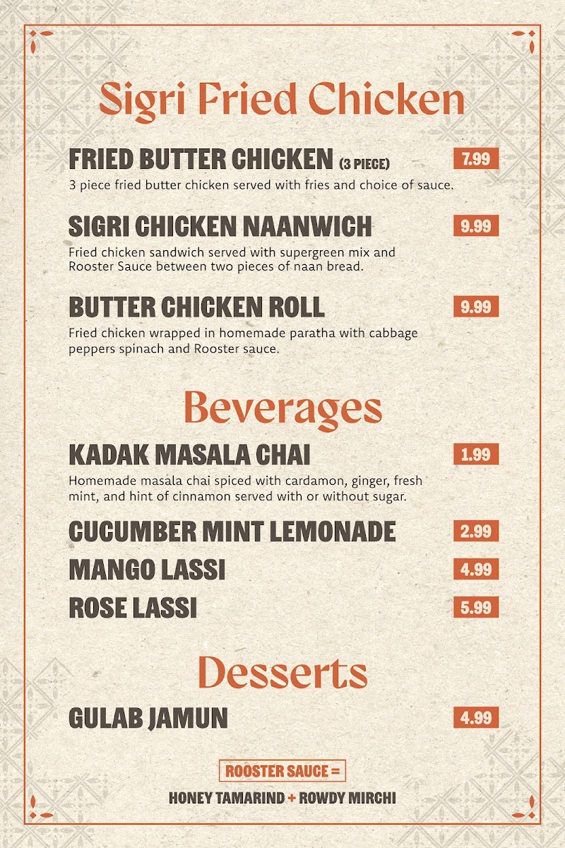 Sigri Butter Chicken hugged by naan buns, with a supergreen mix, onions, and zesty Rowdy sauce. Choose from onion cilantro, cabbage carrot, cucumber radish, beets, or no salad.